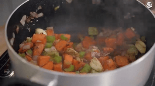Set aside the beef once seared then in he same pot saute the carrots, onion, celery and garlic until the garlic has softened.