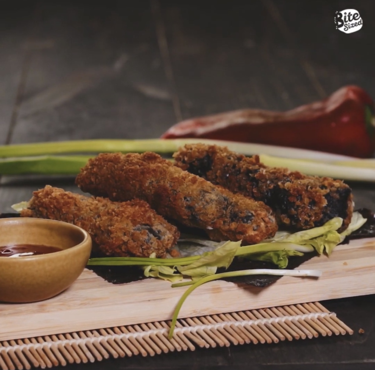 Take some of the seafood mixture and place cheese sticks in the middle. wrap the stuffed mixture in nori then coat with flour, eggs, and breadcrumbs until well coated.