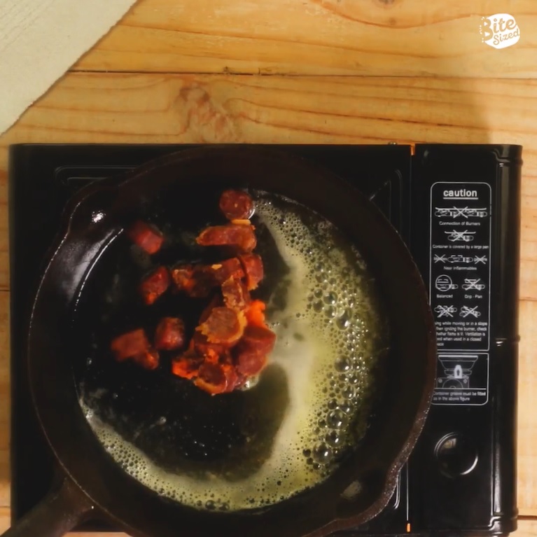 In a pan over medium heat, sauté the chorizo in butter until it releases its fats and oils.