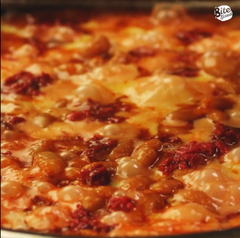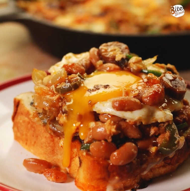 Add HUNT’S Pork and Beans and continue cooking for about 3 – 5 minutes. Season to taste with salt and pepper. Using a spoon, create small wells throughout the sauce for the eggs to sit in.