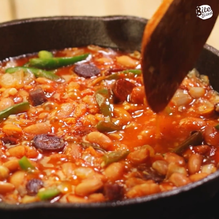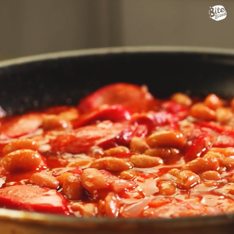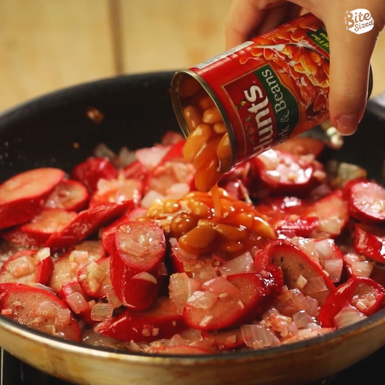 Add HUNT’S Pork and Beans and mix. Cook for a few minutes.