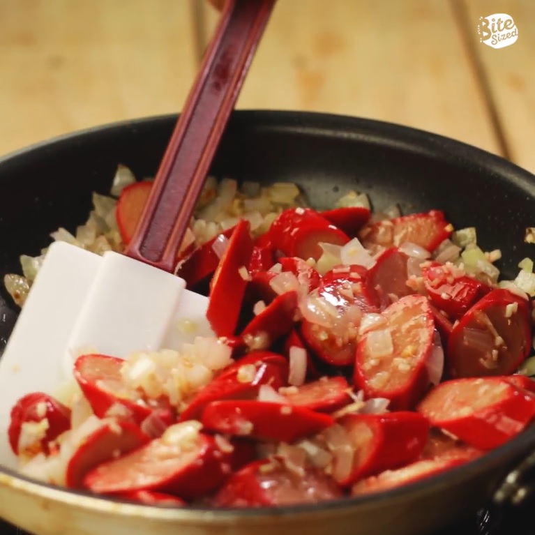 Add hot dogs and continue cooking for a few minutes. Season to taste with salt and pepper.