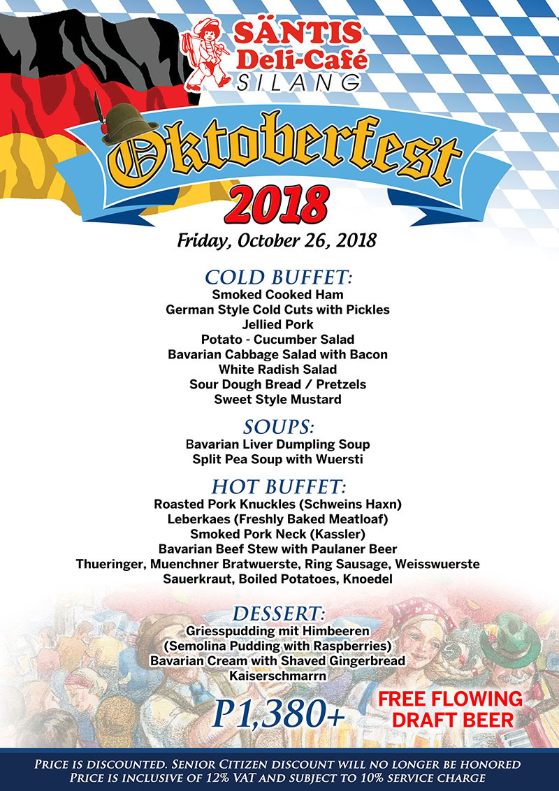 Did you say BUFFET? We’re in! Head to Silang Cavite this October 26 for free-flowing draft beer and authentic German cuisine. Expect the best in traditional Bavarian food from cold cuts, pretzels, Sauerkraut, Roasted Pork Knuckles, sausages, to desserts as Santis goes all out for a last Oktoberfest hurrah. Only PHP1,380 per person!