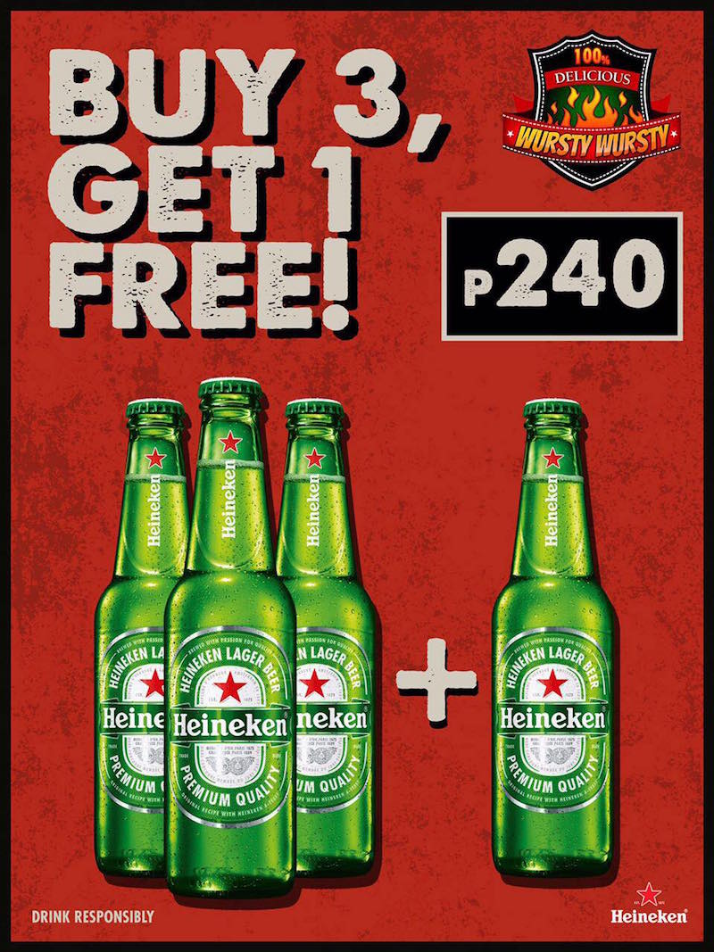 Looking into sampling the best German sausages for an authentic beer fest? Head to Wursty Wursty in McKinley Hill Taguig! Order a platter and choose from the different beer promos happening this October: San Miguel Buy 1 Take 1, Mulefest Bucket, or Heineken Buy 3 Get 1 Free!