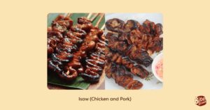 Isaw or intestine comes in two options: chicken or pork. The innards are thoroughly cleaned then par-boiled with aromatics to get rid of any impurities and bitterness. Afterwards the innards are skewered then grilled while being brushed with thin coats of marinade to add to that savoury taste. For chewier, bigger bites have the pork but if you prefer your isaw to be less fatty then have the chicken.
