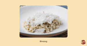 Binatog, bualaw, or kinulti is a corn snack peddled usually as a mid-afternoon treat. White corn kernels are soaked in water until puffed then boiled down until the skin splits and the consistency and texture becomes sticky and tender. You can either enjoy it sweet with sugar or salty with a pinch of salt but the main add-on is a small mound of grated niyog to add texture and taste.