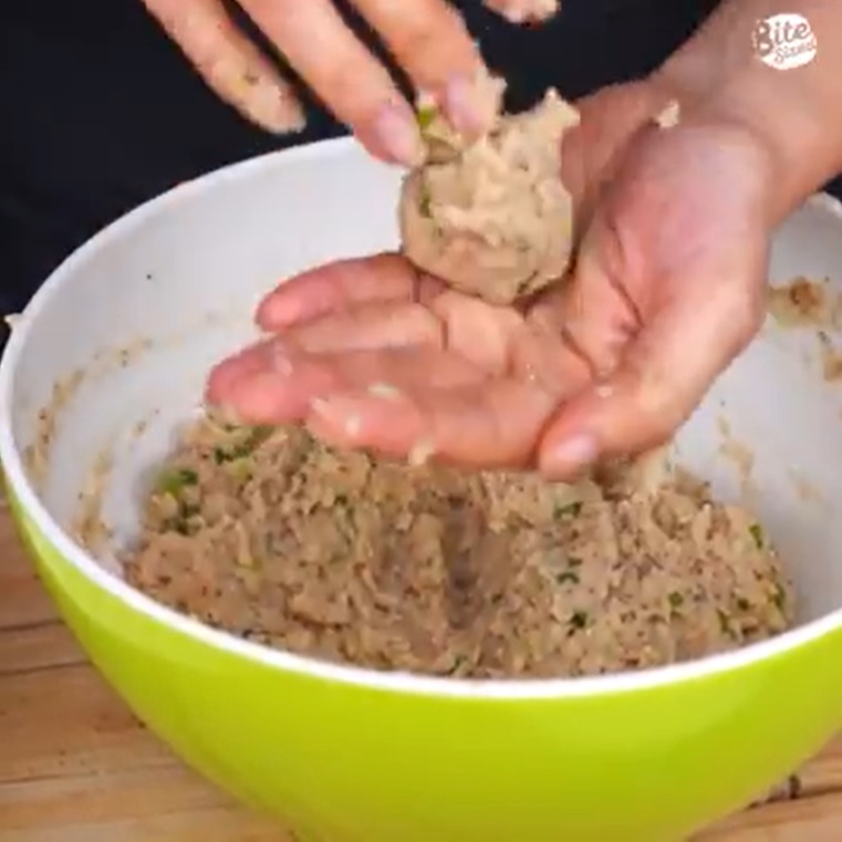 Form by hand into oval-shaped lightly flattened pieces. Dredge pieces in flour, dip in egg then dredge in crumbs.