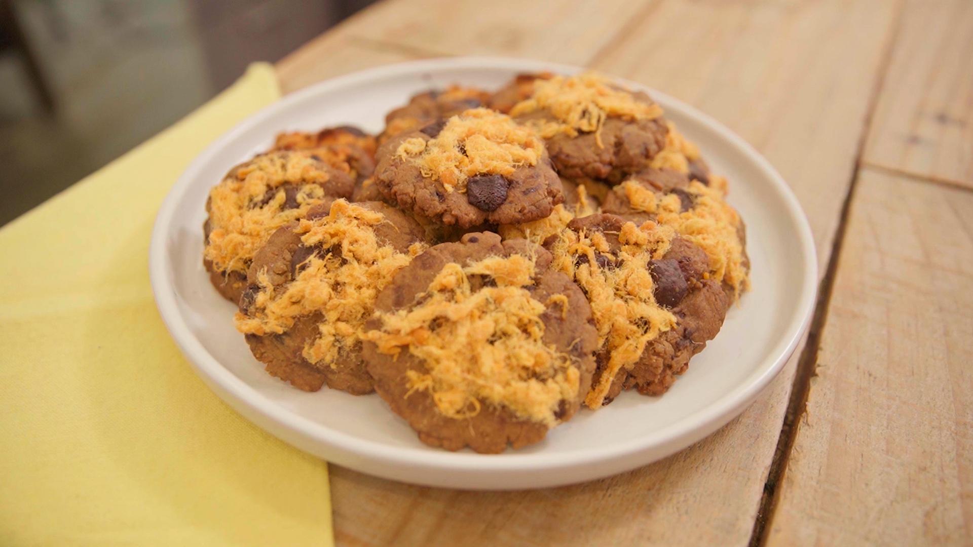 Sprinkle some pork floss on top of the dough balls before popping the baking sheet into the oven.