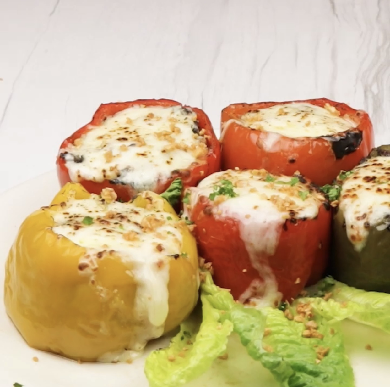 Place the stuffed peppers in a baking pan and drizzle olive oil. Cover with aluminum foil and bake in a preheated 190°C oven for about 30-45 minutes or until pepper is tender and cooked.