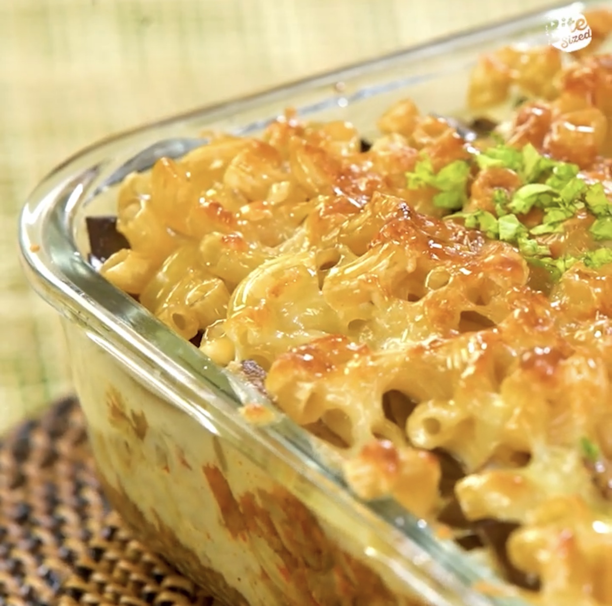 To assemble, get a small ovenproof container, pour a little bit of the tomato sauce and cheese sauce at the bottom. Start making a layer of the macaroni, eggplants, tomato sauce, cheese sauce, and drizzle with mozzarella. Repeat until you’ve created layers that fill up the whole pyrex.