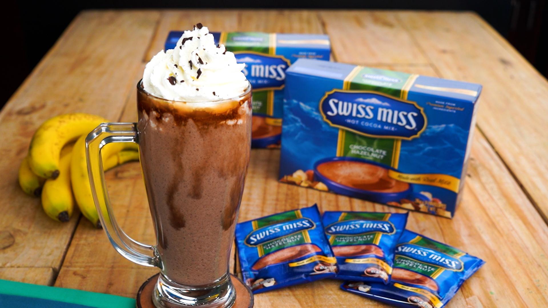 Pour milk and banana into the blender jar. Add the Swiss Miss Chocolate Hazelnut Powder, vanilla ice cream, and ice cubes. Blend until smooth.