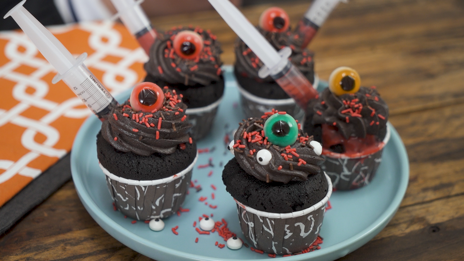 Make a small hole in the center of the cupcake with an apple corer, but do not push it all the way through.
