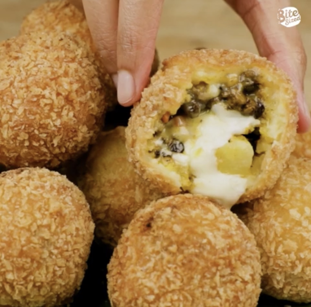 Take a bit of bopis and a cube of cheese and place in the middle of the flattened potato mixture. Form into a ball.