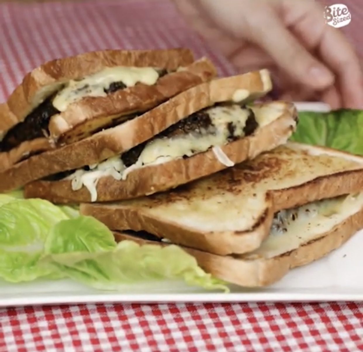On the non-buttered side of the bread place a small amount of both cheese, then the bopis patty and more cheese. Top with another slice of bread. Repeat for other sandwiches.