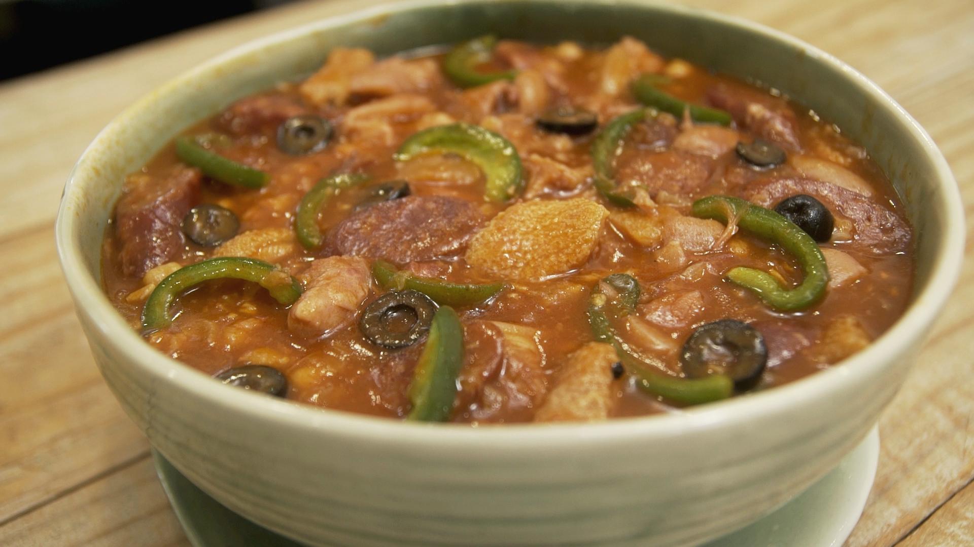 Add chorizo, garbanzos, black and green olives, and bell pepper. Let it simmer for another five minutes.