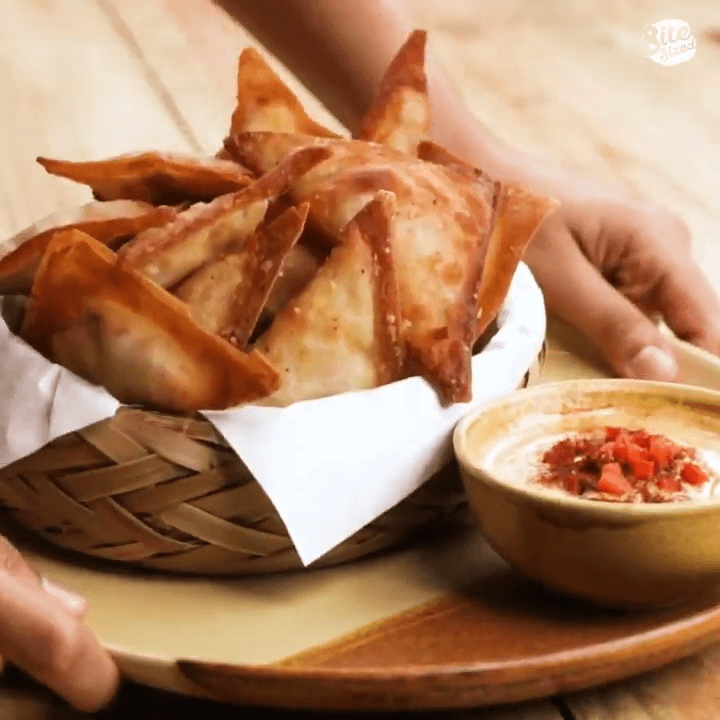 Place a layer of the chicken mixture onto a wonton wrapper then place a bit of cheese pimiento on top. Wet the edges of the wrapper with water and fold the wrapper in half into a triangle and seal.