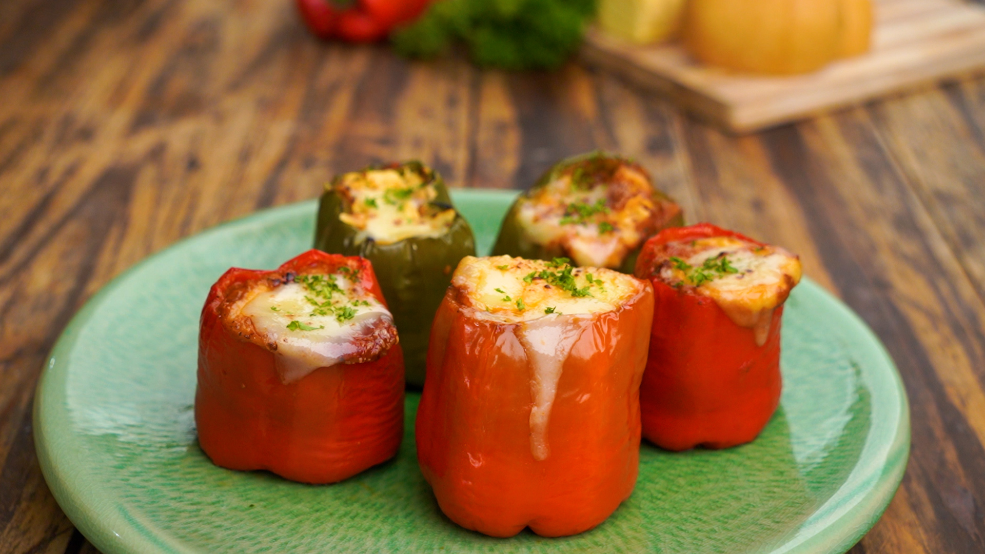 Place the stuffed peppers in a baking pan drizzled with olive oil. Cover with aluminum foil and bake in a preheated 190°C oven for about 30-45 minutes or until peppers are tender and cooked.