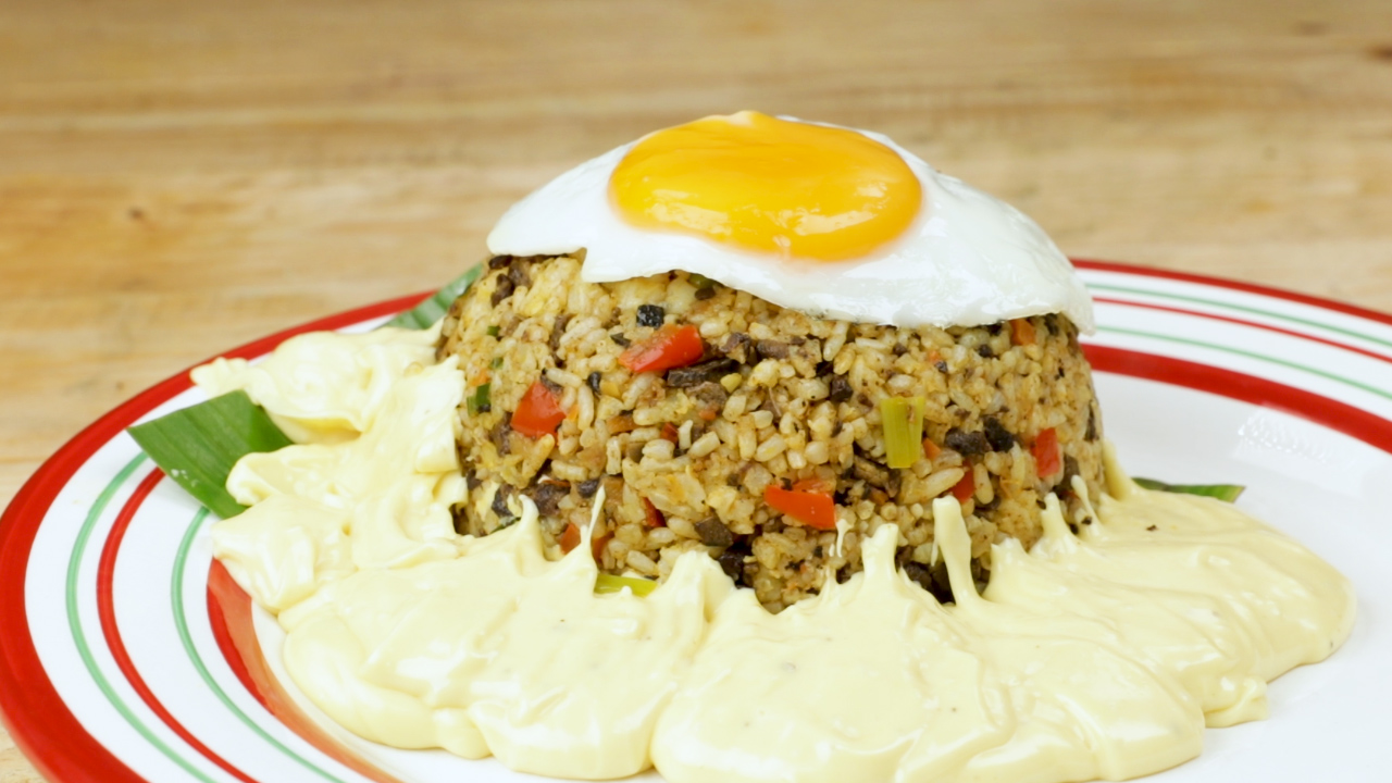 Mound rice and top with egg. Pour cheese sauce around rice.