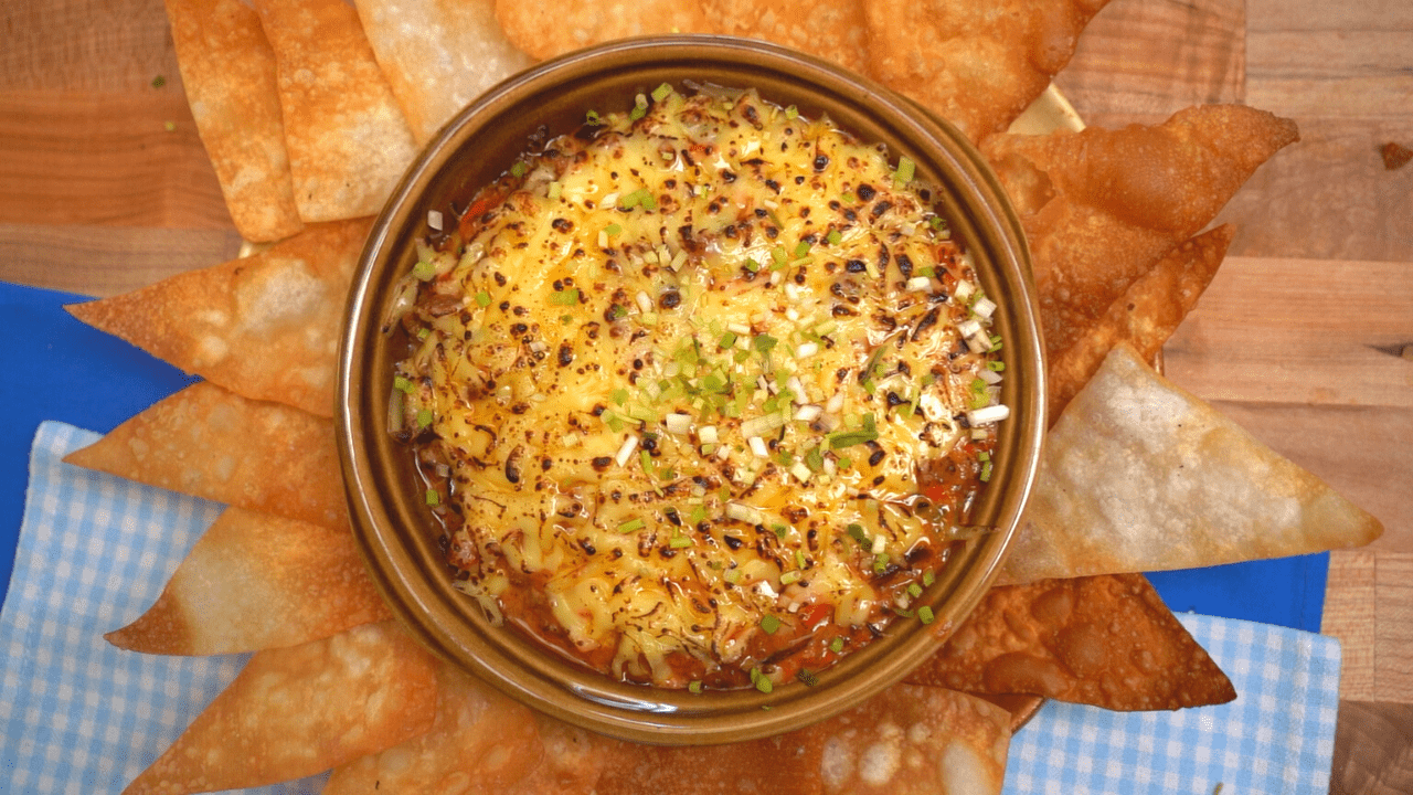 Remove the cheesy kaldereta dip from the oven then garnish with chopped spring onions. Serve hot with the fried wontons.