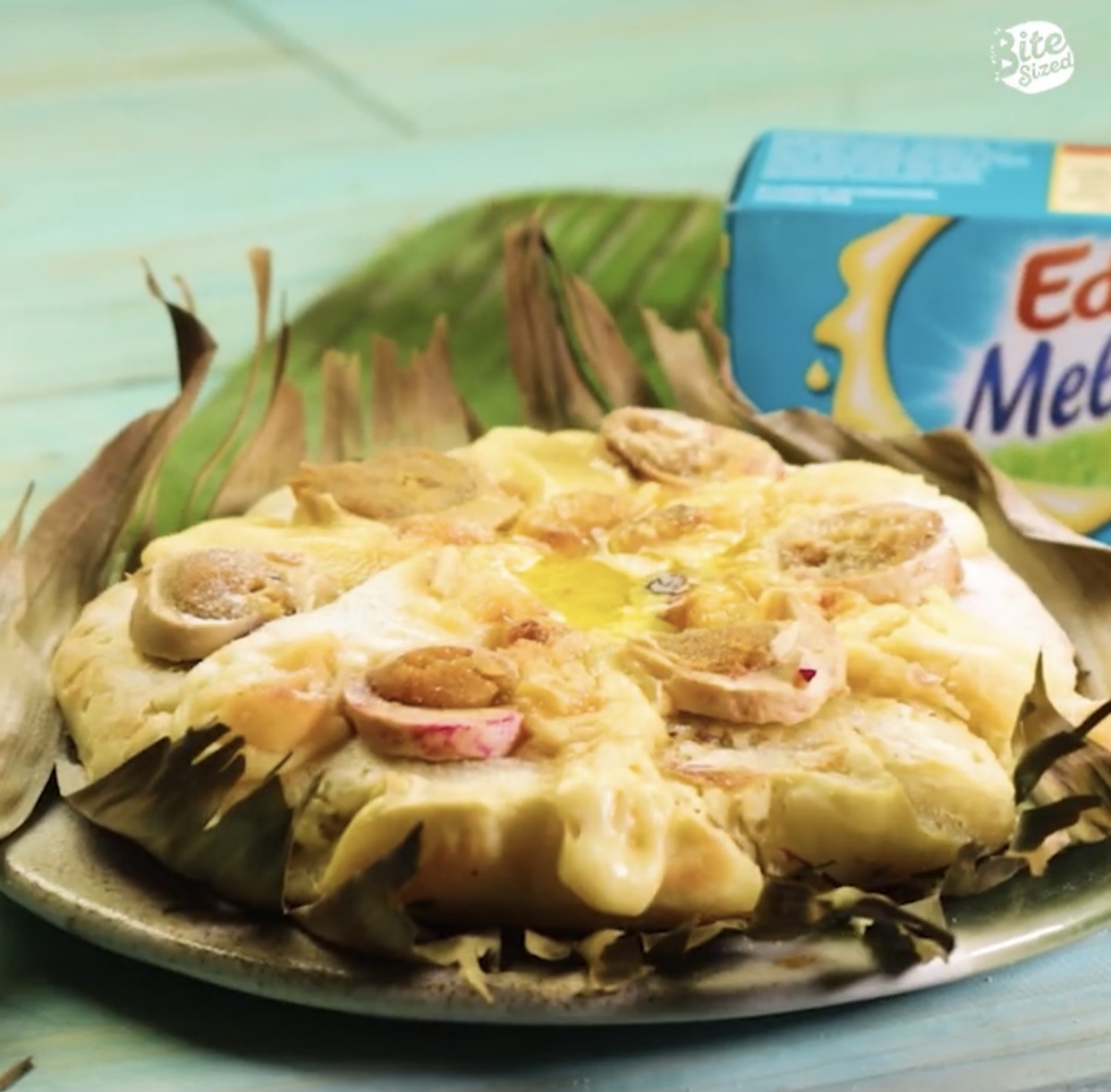 Remove the slightly formed cakes and place EDEN Meltsarap pieces and salted egg slices.