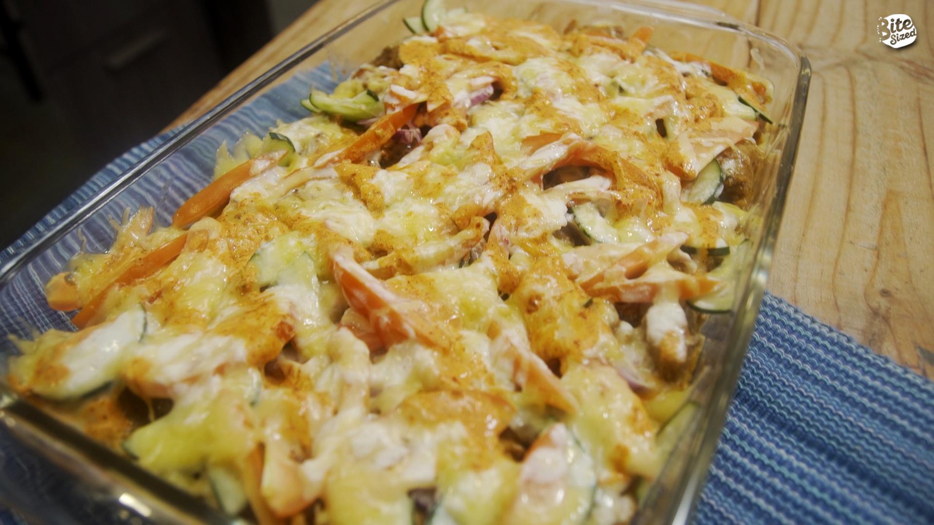 Finish with the easy melt cheese. Drizzle with a bit of white and red sauce. Bake in a pre-heated oven at 375 F for 10 mins or until the cheese melts.