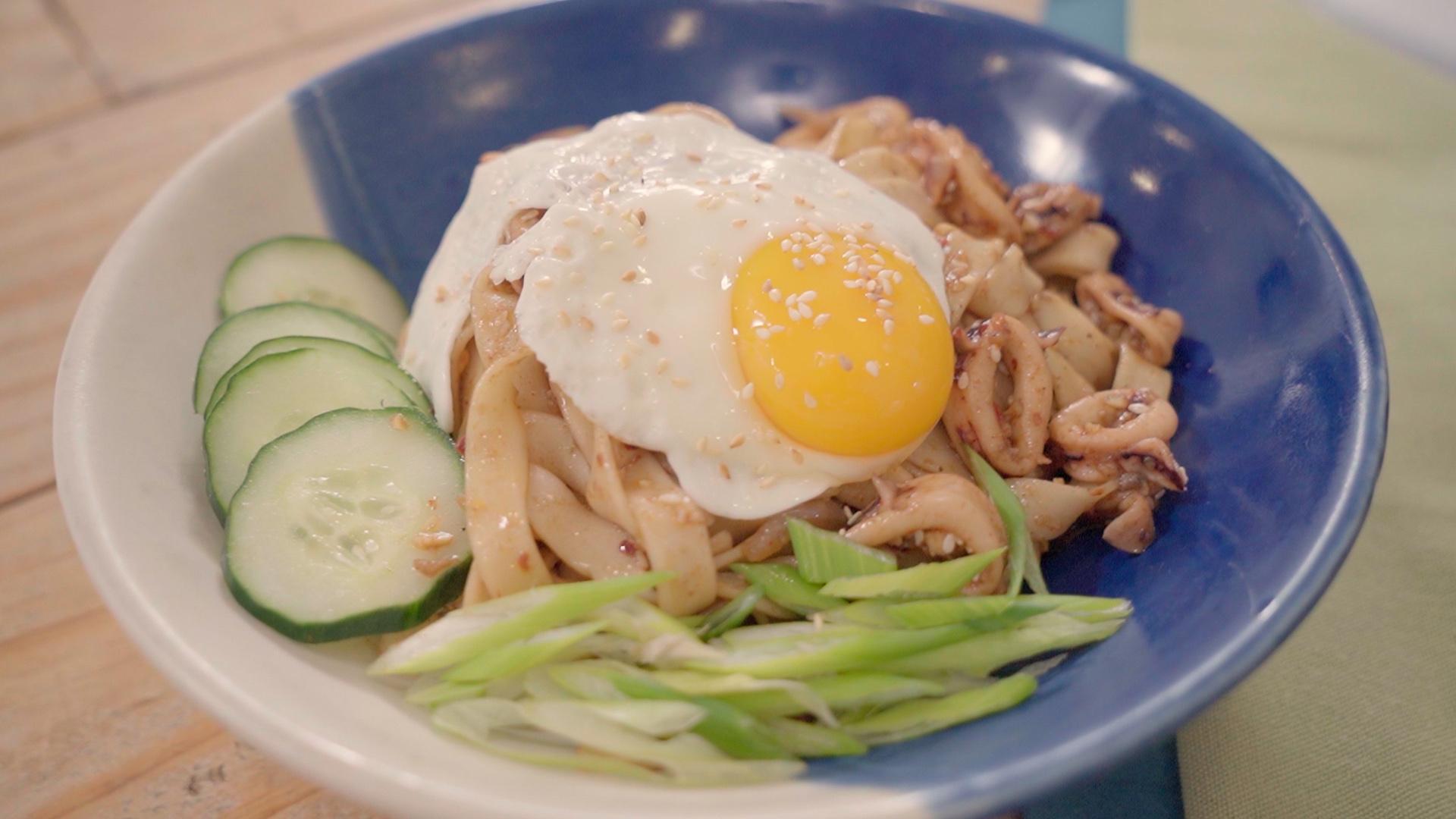 Spicy and appetizing noodles with squid.