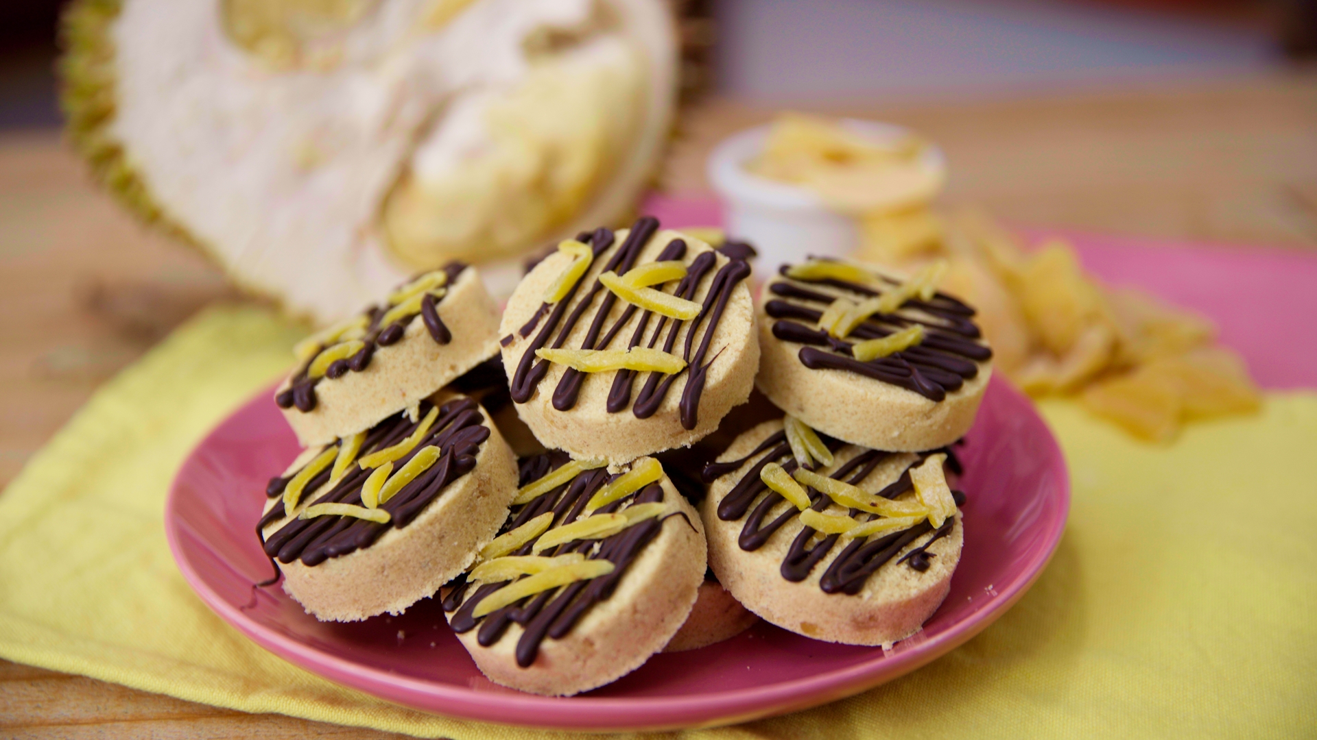 Drizzle of the ganache in the polvoron. Sprinkle it with dried durian. Make sure the chocolate dries at room temperature.