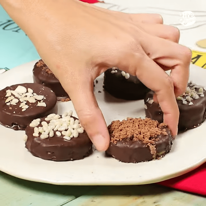 Get the polvoron pieces. Dip each into the chocolate using forks and top with desired toppings. Serve or store in the refrigerator.