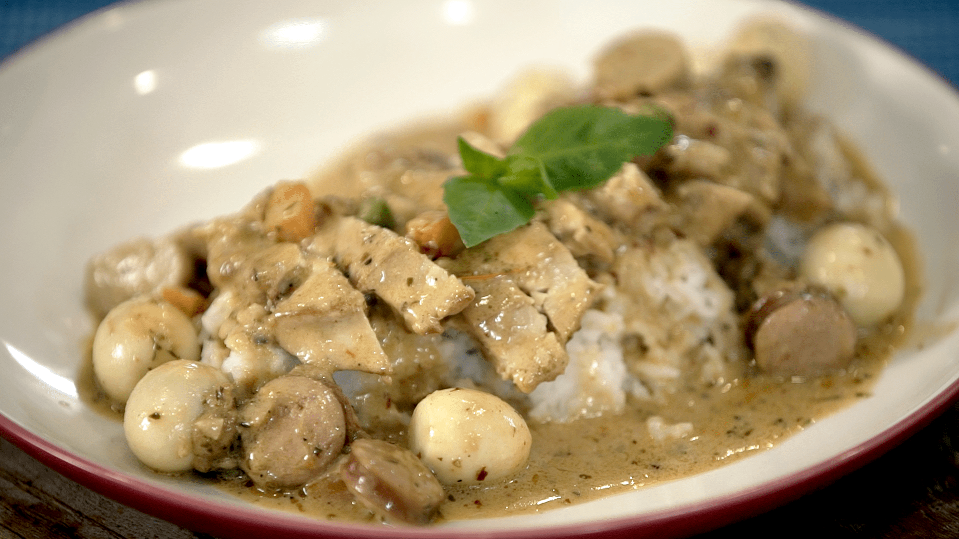 Place the chicken back in the pan, along with chopped sausages and itlog ng pugo. Cover and simmer for another ten mins.