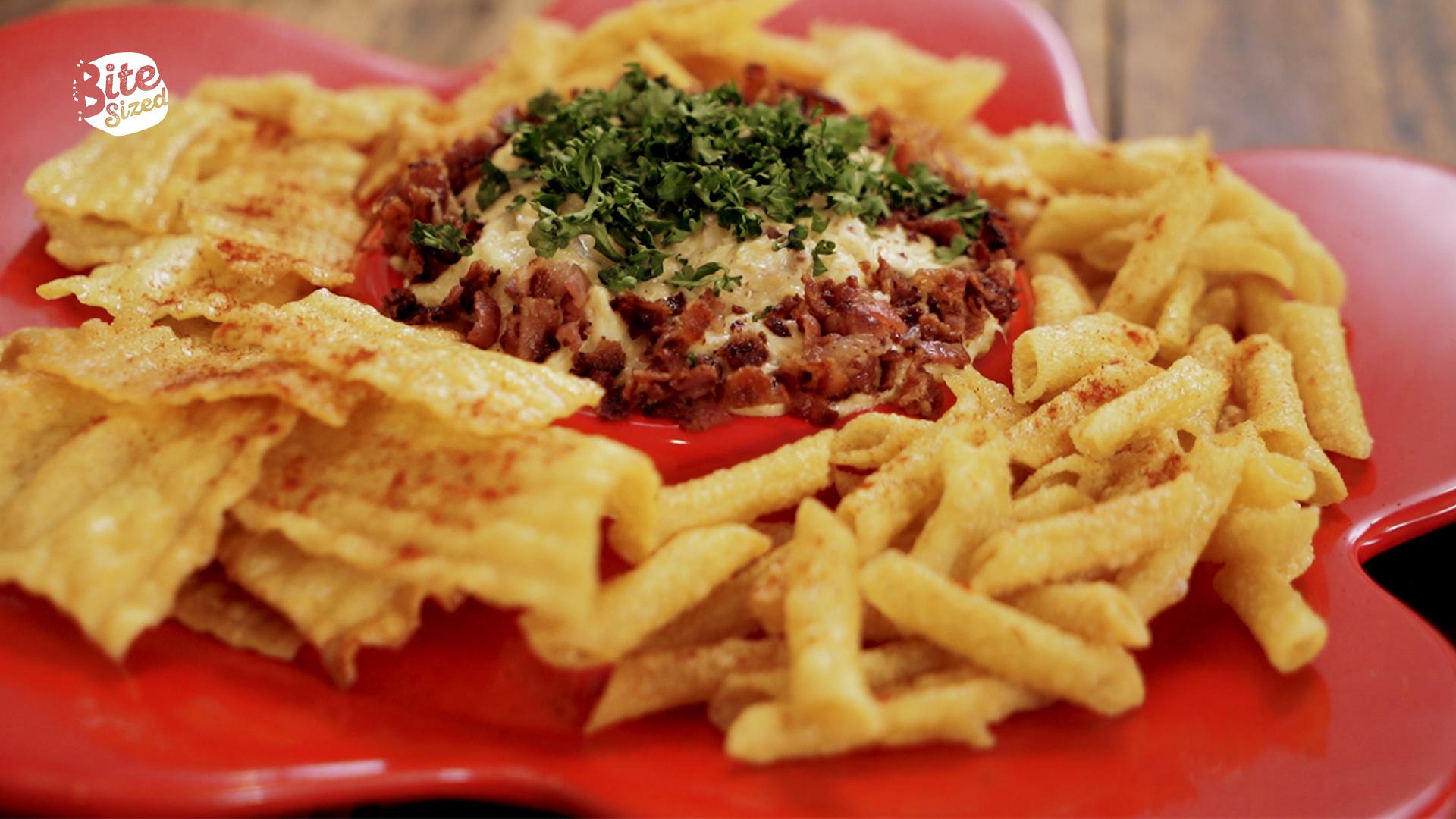 A creamy and cheesy seafood carbonara dip with crispy fried pasta!