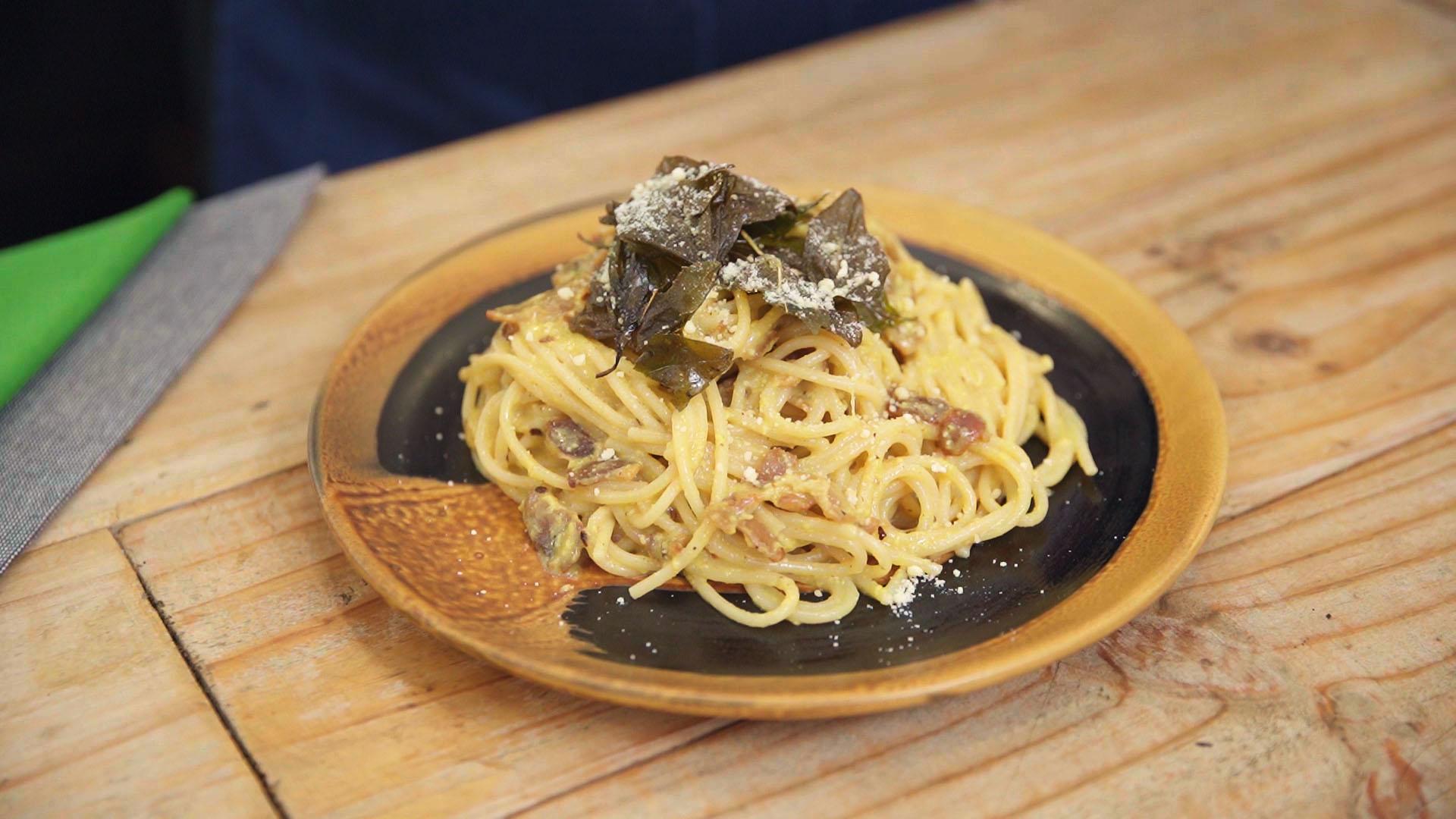 Once the spaghetti is al dente transfer the pasta onto the big pan used to cook the bacon and add the reserved bacon fat. Carefully pour the egg-cheese mixture over the noodles and toss while the pasta is still very warm. Don’t cook over heat as it may cook the eggs. If the sauce gets too thick then pour a bit of pasta water to thin it out. Season with salt and pepper, if needed.