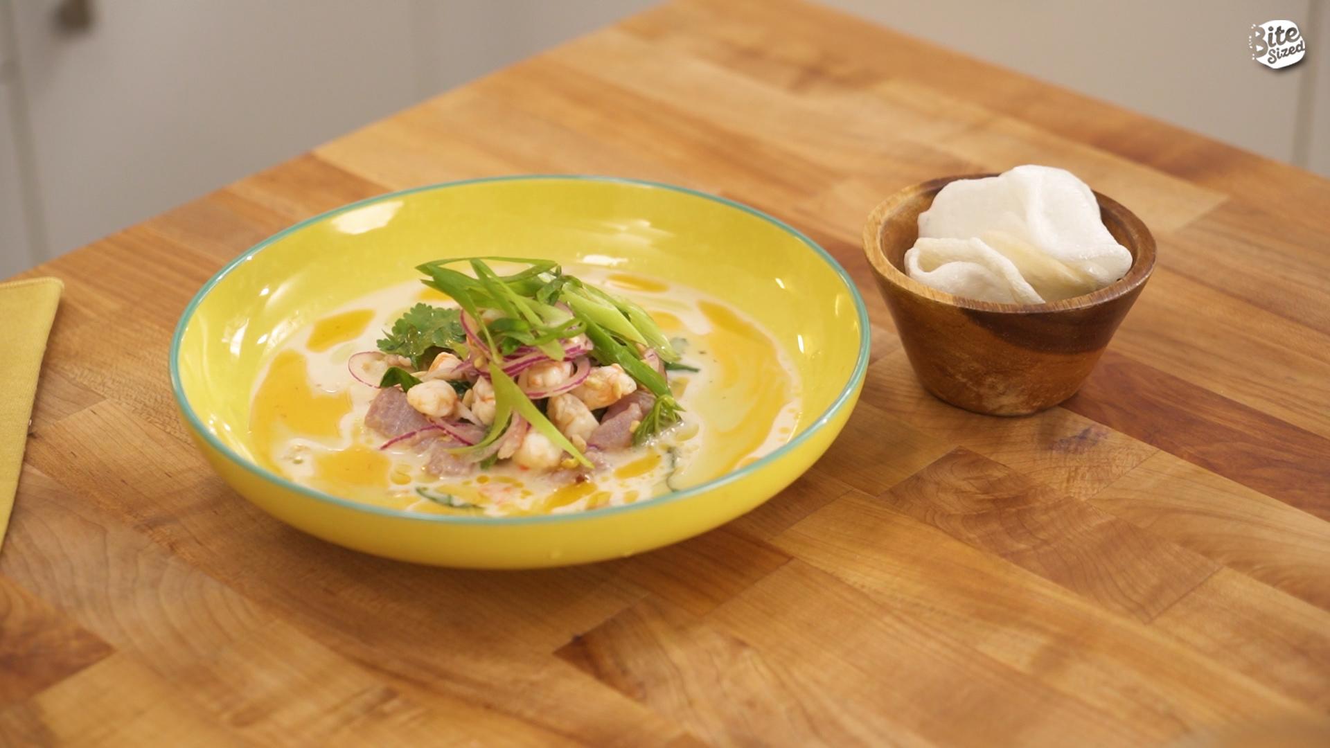 Combine the shrimp, tuna, red onions, Thai basil, cilantro, cashew nuts, and bird-eye chilis in a bowl. Drizzle the calamansi juice then toss the ingredients.
