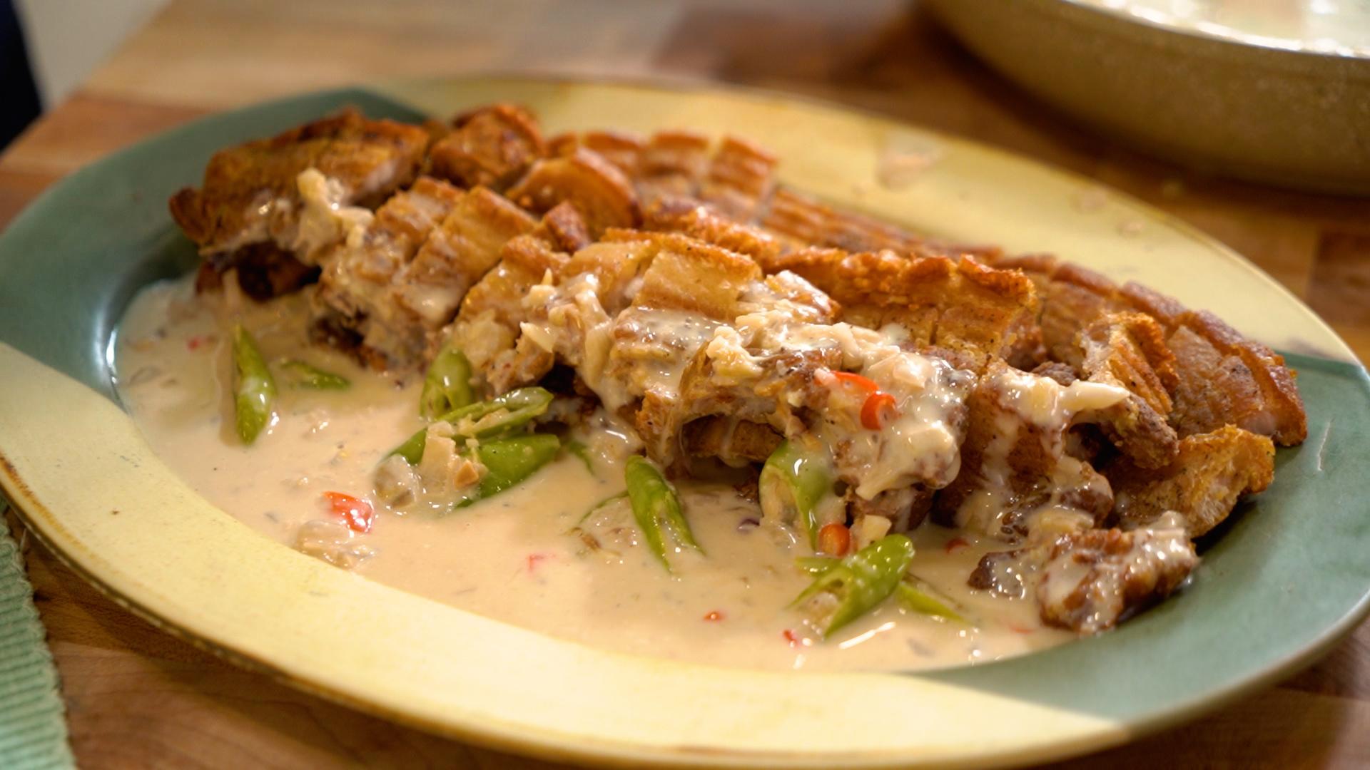Fill a pan halfway with oil then preheat oil to 400F. Fry the belly in the hot oil for 2 mins or until the skin is crispy. Drain excess oil over a colander or paper towel.