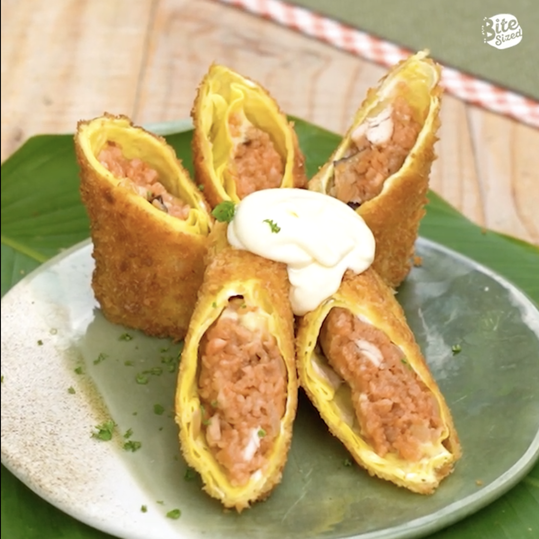 Place 3 to 4 tablespoons of the rice filling into the bottom of each omelet wrapper then gently roll the omelet up tightly.