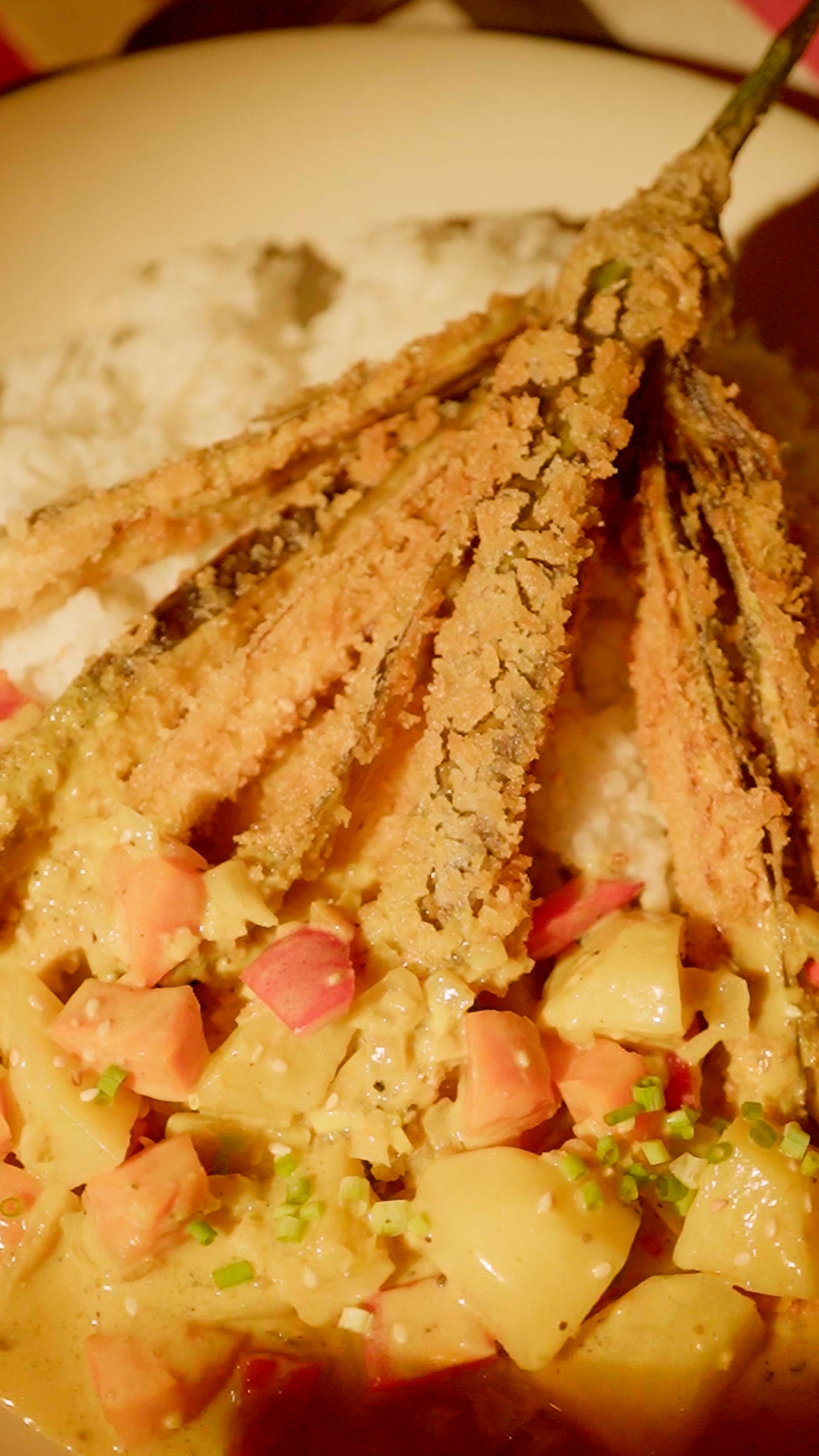 Add the curry powder, water and coconut cream. Simmer for 5 mins