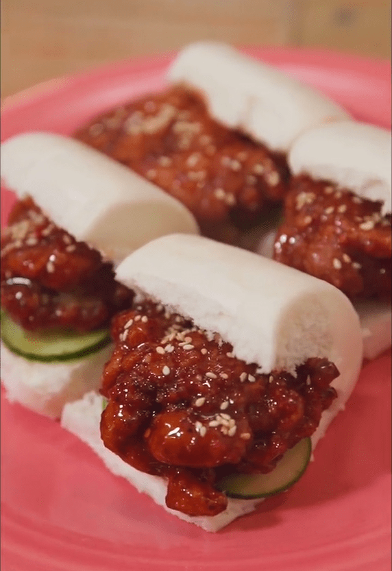 Appetizing Fried Chicken buns witha sweet and spicy sauce!