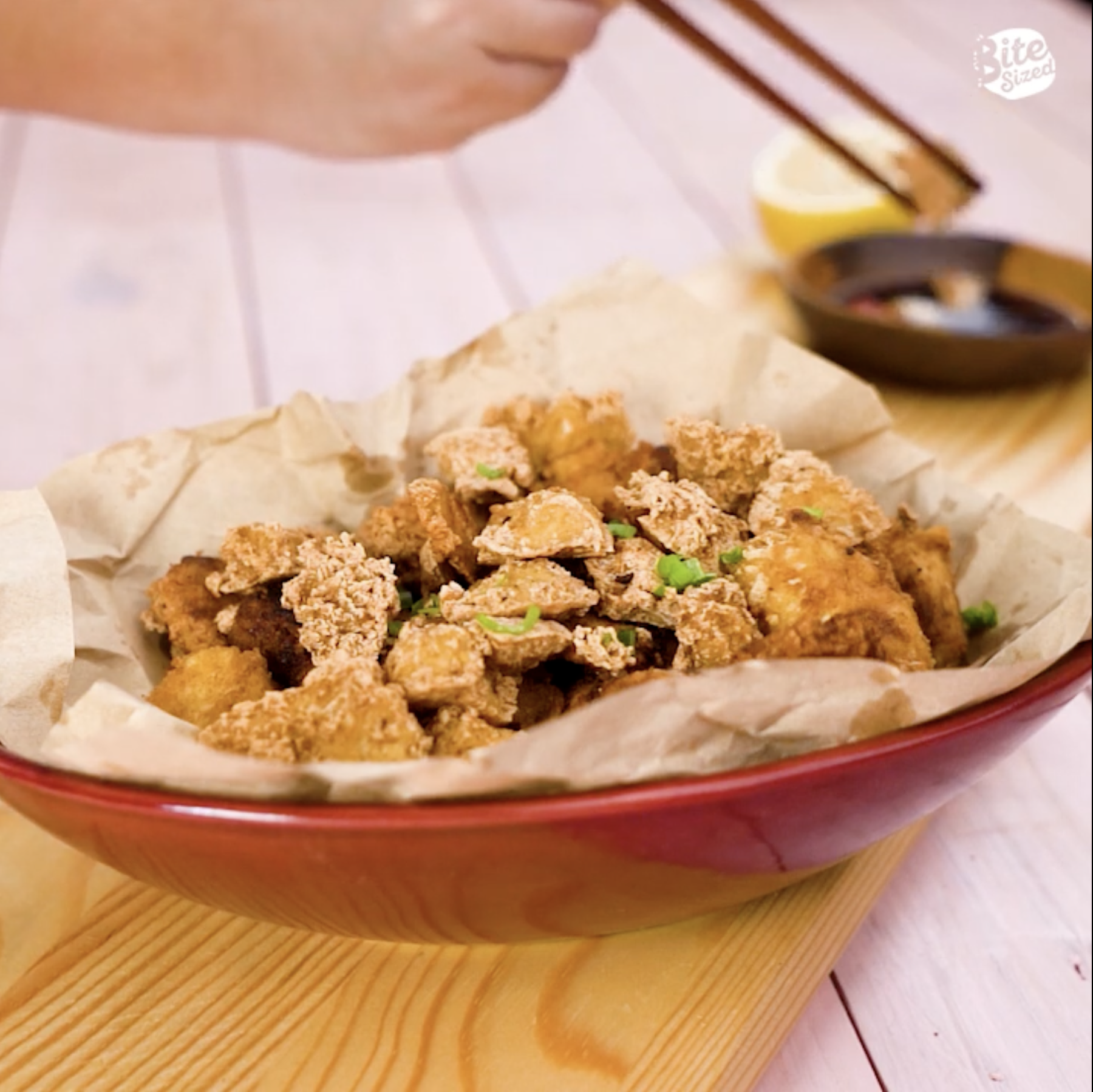 Break the block of tofu into small chunks and add them to the bowl. Toss the tofu well to evenly coat in the sauce mixture.