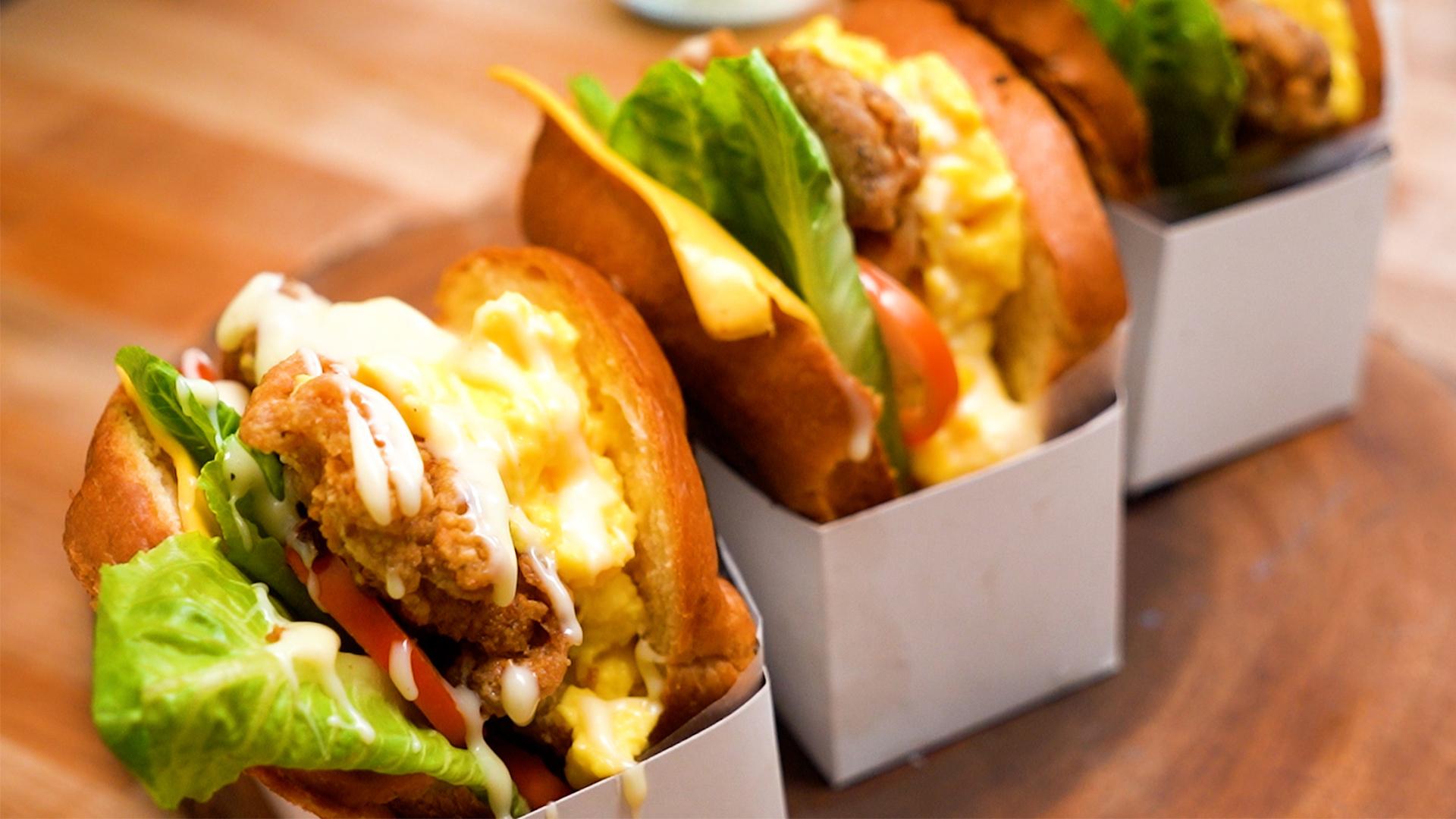 Using a parchment paper wrap the bottom half of the sandwich to hold everything in place. Serve in a cardboard box holder to complete the egg drop experience or simply serve on a plate. Drizzle with sweet mayo and/or spicy mayo before serving.