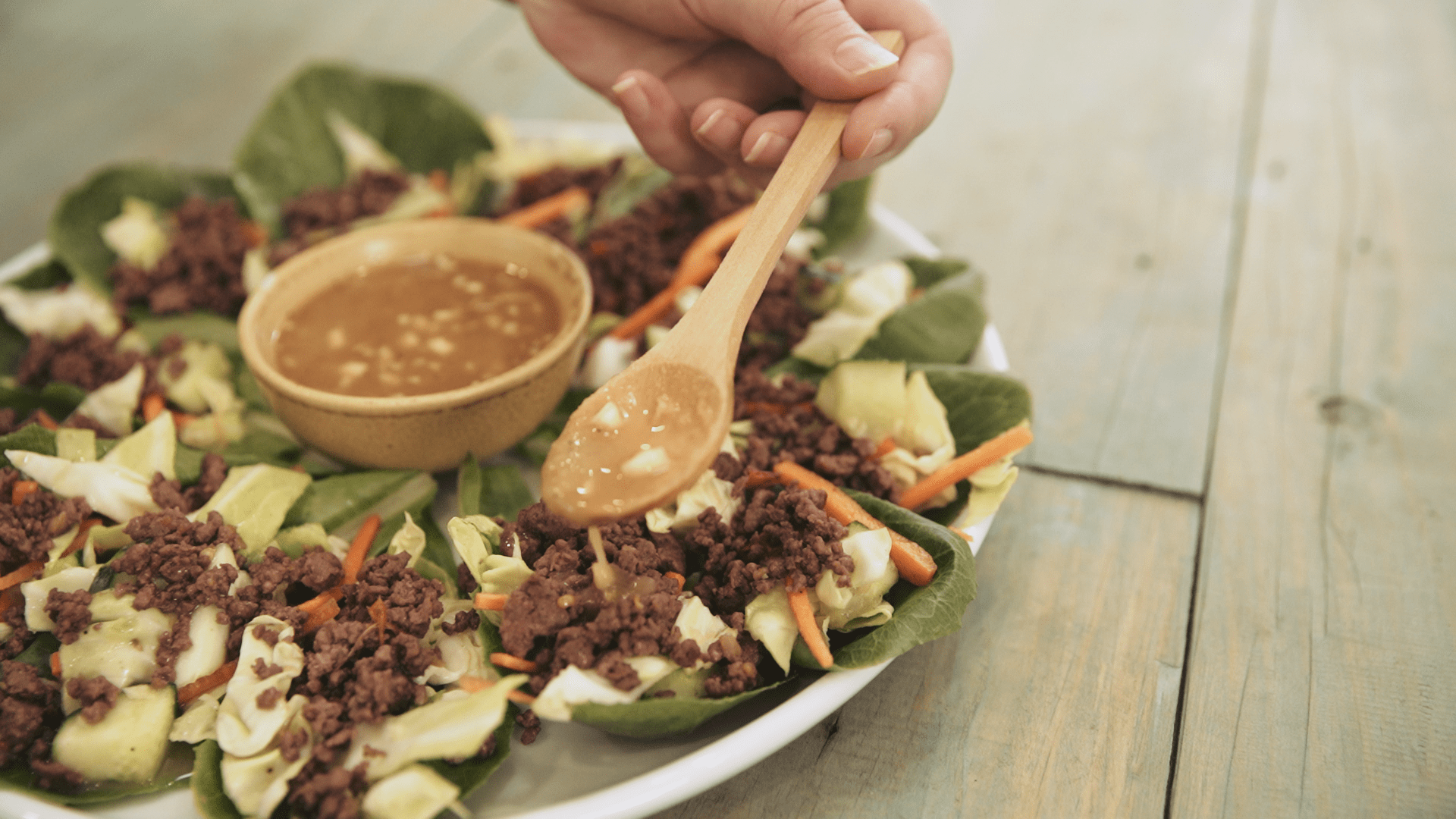 Add the cucumber, cabbage, carrots in a bowl then drizzle with about three tablespoons of of miso dressing. When the beef is done set it aside to cool a bit.