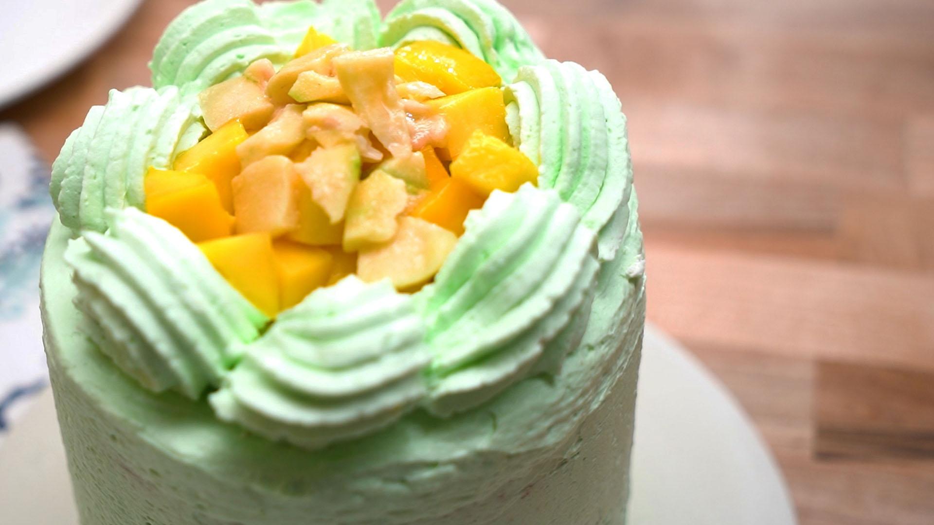 Coat the whole cake generously with the remaining frosting using a large offset spatula. Place diced mangoes and guava slices on top for garnish. Let it chill for 10-15 minutes before serving.