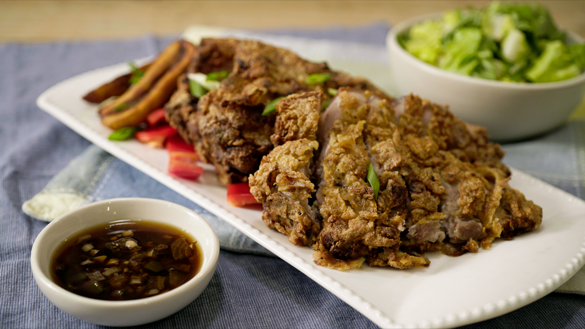Enjoy the rich flavors of fried pork chops marinated in ginamos, offering a perfect blend of savory and salty. Crispy on the outside and tender on the inside, these chops are a delicious twist on a classic favorite.