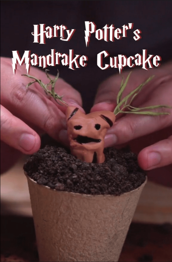 Sprinkle on top with crushed chocolate cookies and top with mandrake fondant.