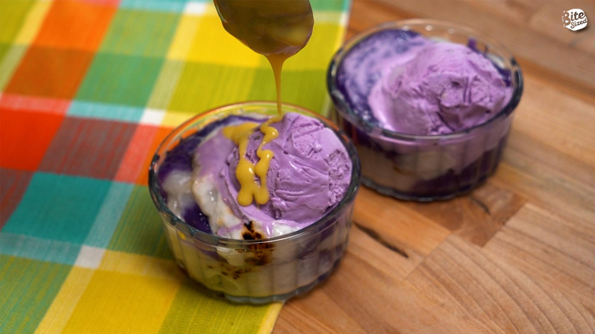 To serve, scoop a generous serving of inutak and top with ube ice cream. Drizzle it generously with the salted egg sauce all over. Serve immediately.