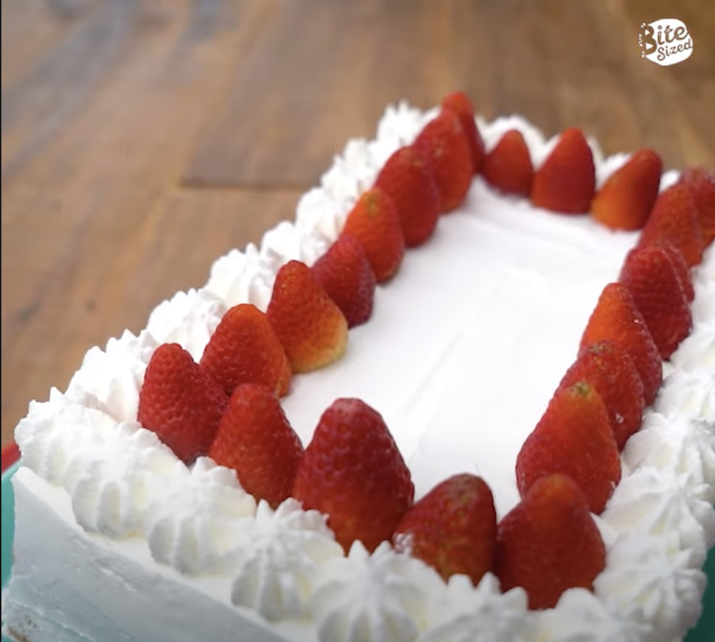Cover the entire cake with more cream. Decorate with more piped cream and strawberries.