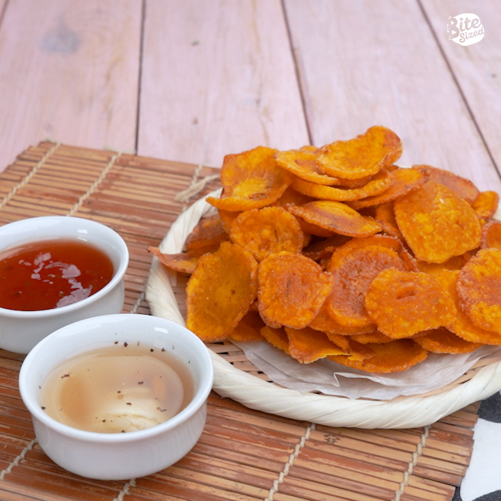 Heat oil in a large wok/pot over high heat and drop the dried kalabasa chips until they puff up. Drain excess oil and serve immediately. Serve with sweet chili sauce or spiced vinegar.