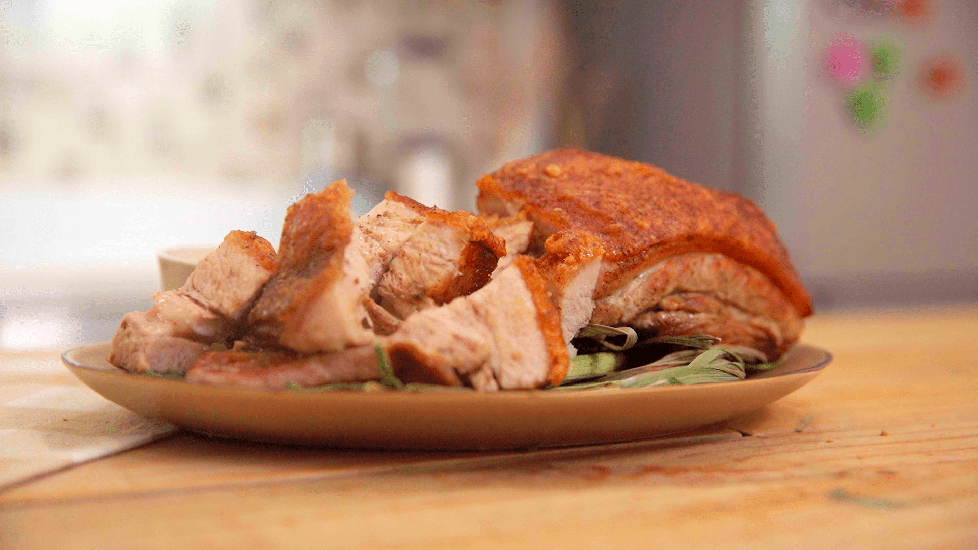 Massage the pork belly with salt and pepper. Make sure the pork belly slab is well seasoned. Chill the pork belly in the fridge for at least 2 hours.
