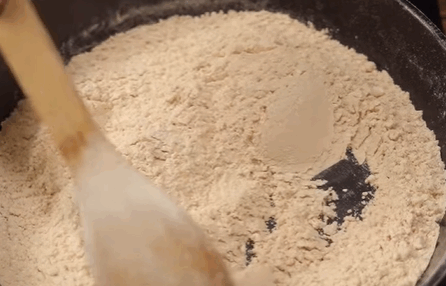 In a dry pan over low heat, toast the flour for 8–10 minutes until golden and nutty. Stir constantly. Let cool.