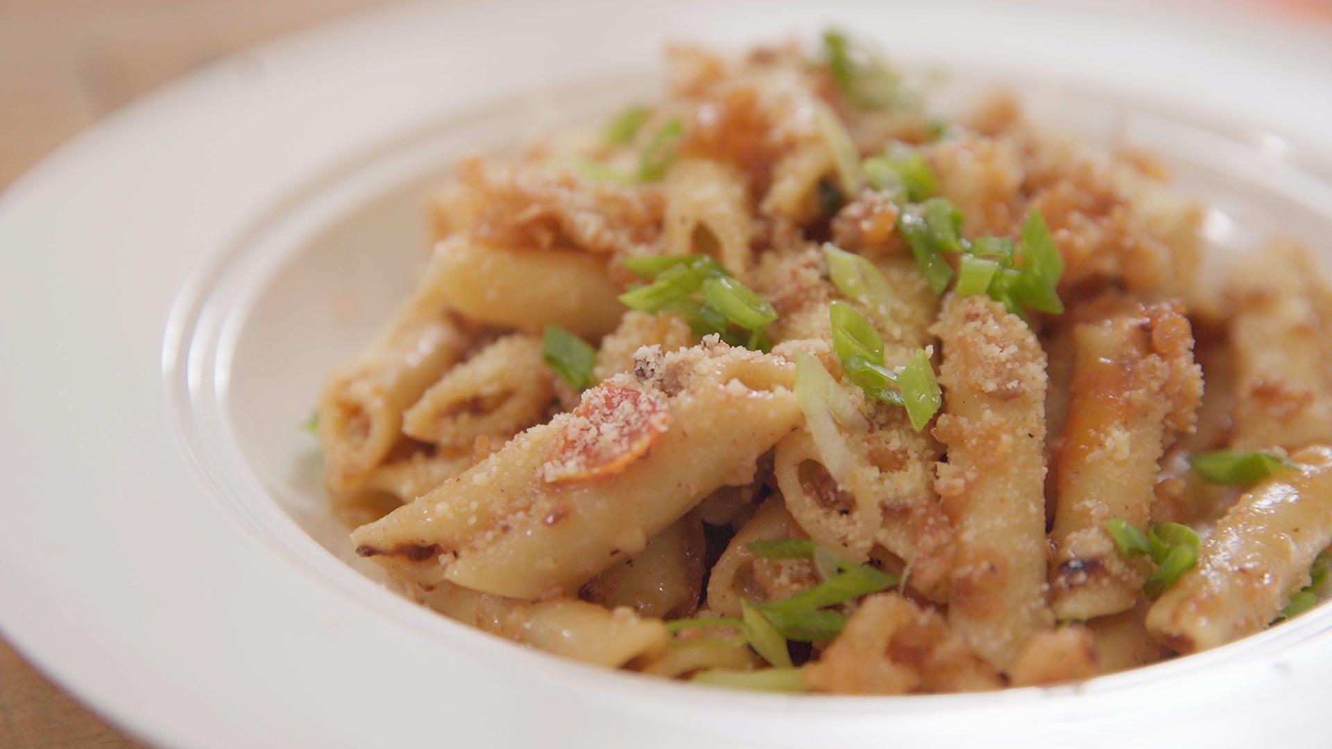 Stir in the cooked penne then add cheese. Transfer to a plate then garnish with onion leeks, chicharon and more cheese.