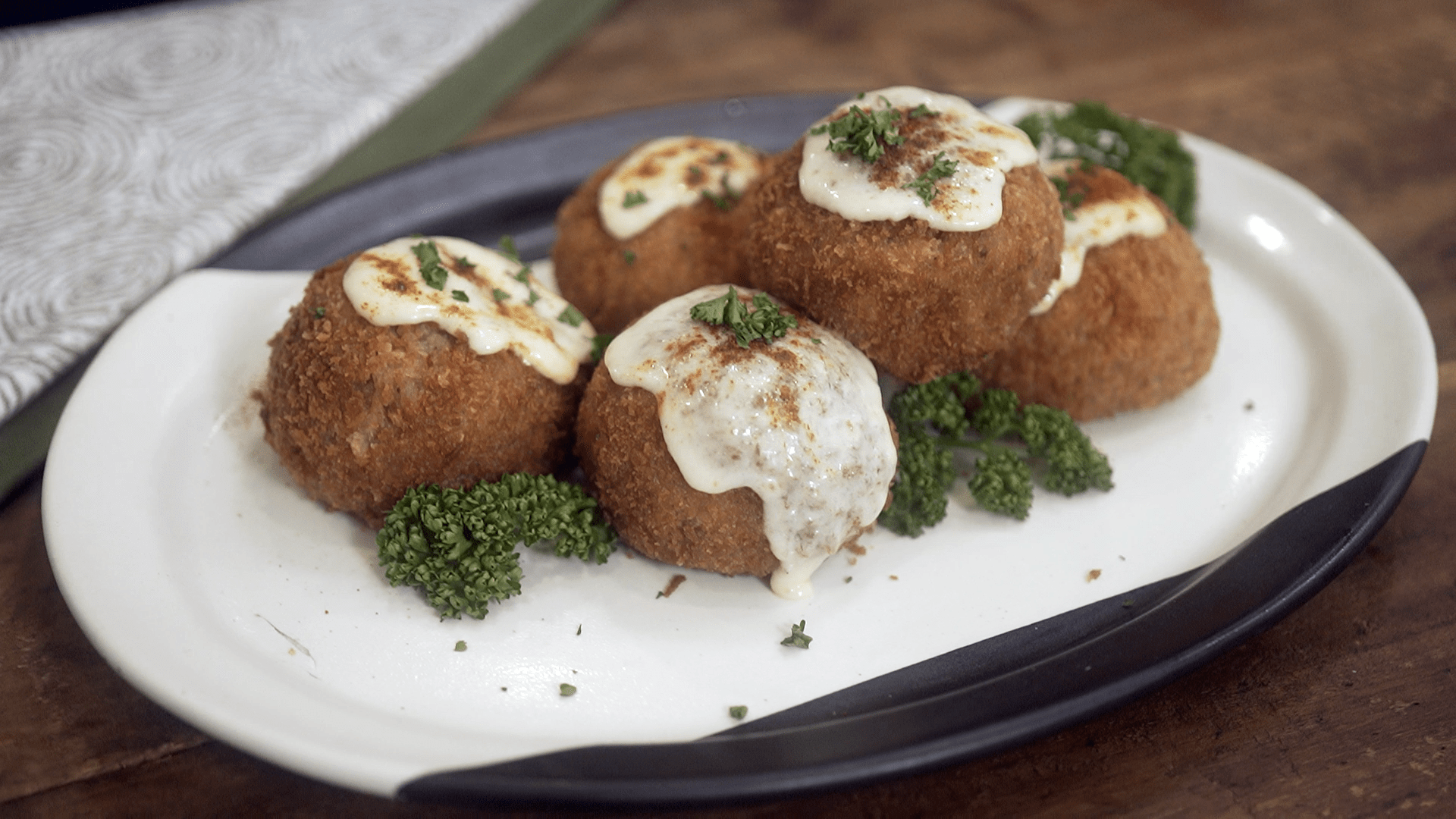 When ready to fry, prep your breading station: cover the rice ball with flour, dip in the beaten eggs, and finally with the breadcrumbs.