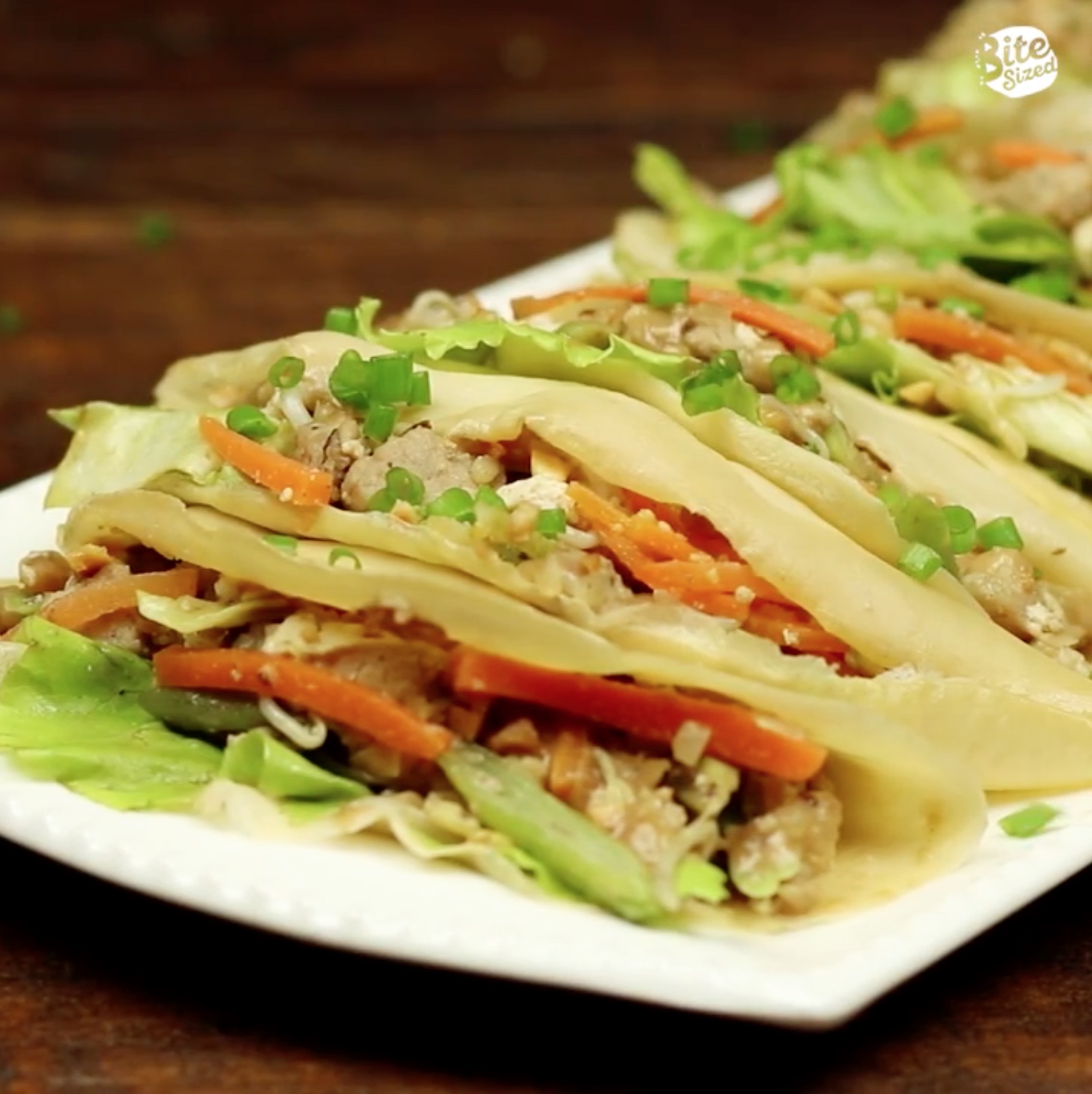 Sandwich the wrapper and garnish with chopped spring onions.